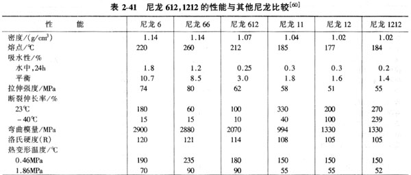 尼龍612和尼龍1212的共同特點是吸水性低,故制品尺寸穩定性優良。能耐酸、堿和溶劑,主要性能列入表2-41。尼龍612和尼龍1212的注射成型和擠出成型基本上和尼龍6、尼龍66相同。主要用于汽車、電器、機械等行業,如線圈骨架,電線電纜的絕緣層,燃料油管道、油壓系統管道、導管等。