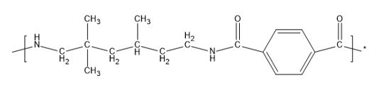 TMD為2,2,4和2,4,4-三甲基己二胺的混合物,T為對苯二甲酸,三個側(cè)甲基和芳香族環(huán)狀結(jié)構(gòu)阻止了高分子鏈之間的分子鍵結(jié)合,形成無定形態(tài)聚合物,具有高透光性。